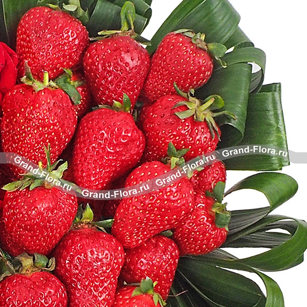 Стандартный (на фото): роза красная - 7 шт, клубника - 0,5 кг, листья аспидистры (загнутые), оазис.