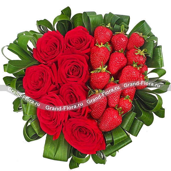Композиция в виде сердца из всеми любимых роз и сочной, ароматной клубнички. Прекрасный подарок сделает Ваших любимых и близких людей счастливее, наполнит их день вкусом и позитивными эмоциями, передастВашинежные чувства и оставит приятное впечатление.
