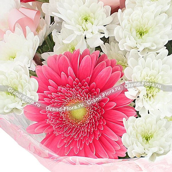 Стандартный: хризантема кустовая белая - 4 шт., гербера розовая - 3 шт., фетр розовый, лента.