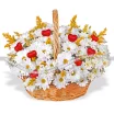Уменьшенный: хризантема кустовая ромашковая белая - 5 шт., солидаго - 3 шт.(возможна замена на декоративную зелень), оазис, сердечки маленькие красные (декоративные) - 3 шт., корзина малая.