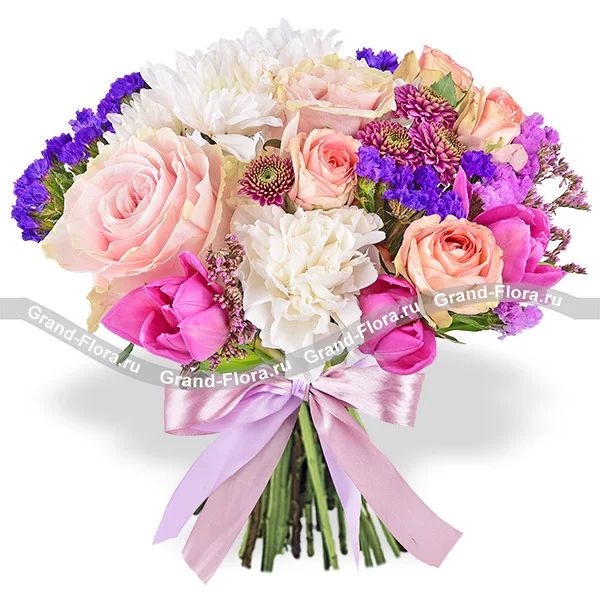 Стандартный: роза розовая - 4 шт., роза кустовая розовая - 2 шт., хризантема кустовая белая - 1 шт., гвоздика белая - 2 шт., тюльпан розовый - 4 шт., хризантема кустовая фиолетовая - 1 шт., статица, лимониум, лента.Примерный размер: 30Х30 см.